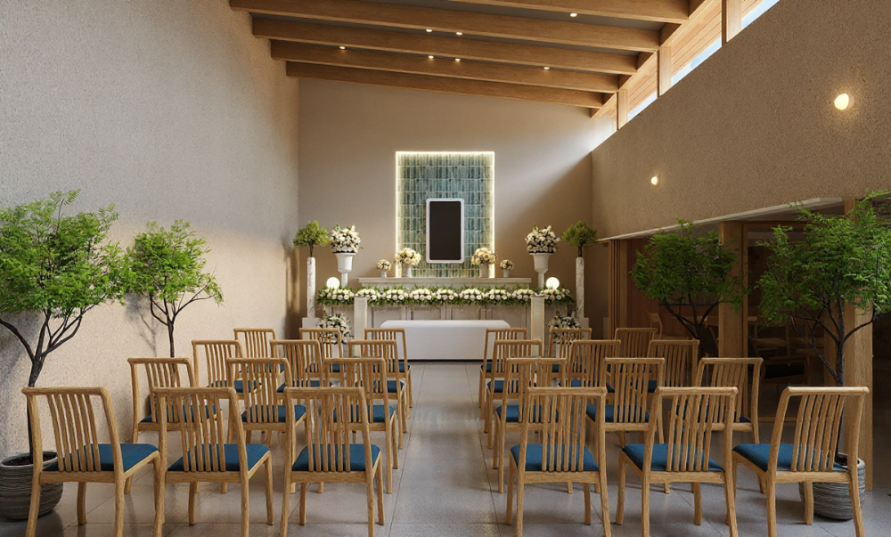 従来の葬儀場のイメージを一新し、自然光が差し込む明るく開放的な空間で、大切な方との最期の時間を穏やかに、そしてゆったりとお過ごしいただけます。