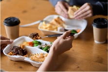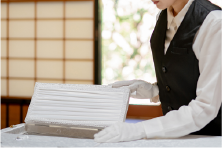 通夜後のお食事の席を整えます。ご遺族や参列者がゆっくりと語らえるよう、心を込めて準備します。 -